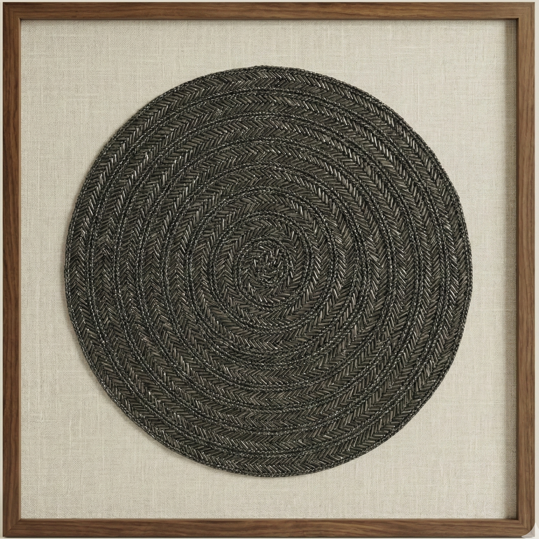 Hand-Beaded Charcoal Spiral Framed Wall Art | Modern Textured Textile Art on Linen